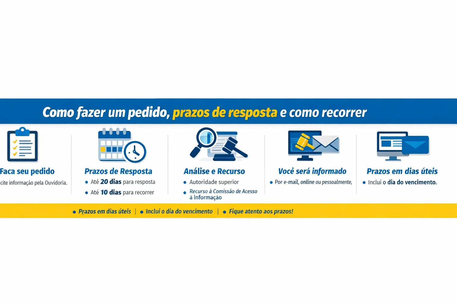 Os órgãos e entidades tem prazo de até 20 dias para emissão de resposta, sendo possível a prorrogação por mais 10 dias, mediante justificativa ao cidadão. O SIC Ouvidoria-Geral e os SICs dos órgãos e unidades são parceiros no acompanhamento dos processos para cumprimentos dos prazos legais.